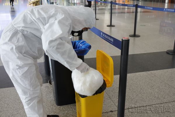 航站楼内设有多处垃圾分类处,尤其是医疗垃圾桶,大家将废弃口罩等医疗废弃物放入专用垃圾桶后,由医护人员统一处理。