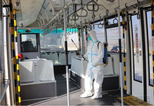 航班登机后,遇到远机位要乘坐摆渡车,工作人员在旅客乘车前就会对摆渡车内部进行消毒,每运行一班次就会及时消毒。