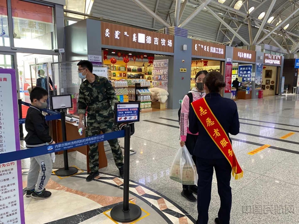志愿者引导旅客排队测温