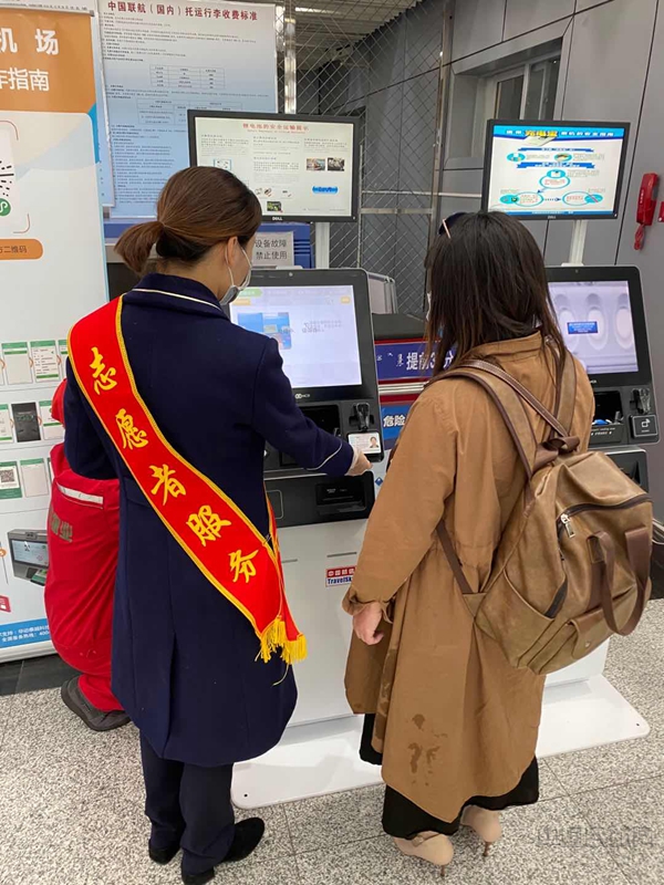 志愿者帮助旅客使用自助值机