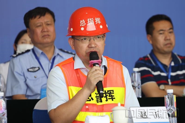 演练结束后,石双喜代表通辽市人民政府向参加此次演练的所有单位、全体指战员、工作人员表示了慰问及感谢!他表示,近年来,通辽机场运输生产增势迅猛,旅客吞吐量和航班起降架次显著提升。在快速发展的过程中,通辽机场要进一步加深对做好应急救援工作重要意义的认识。并对机场应急救援管理工作提出四点要求,一是全面完善应急救援工作组织体系,二是严格按照通辽市总体预案和相关专项预案的要求,完善机场各项应急预案,三是加强应急培训演练,四是进一步加大宣传力度,加强机场应急预案和应急知识方面的宣传。
