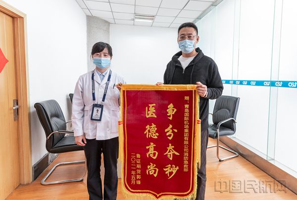 《中国民航报》、中国民航网 记者许晓泓 通讯员张孟璐 报道:5月7日,远在外地出差的旅客郭先生委托其在青岛的同事将“医德高尚 争分夺秒”锦旗送给青岛机场医务急救站的罗晓飞医生,以表示此前罗医生紧急救治郭先生并送医的感激之情。