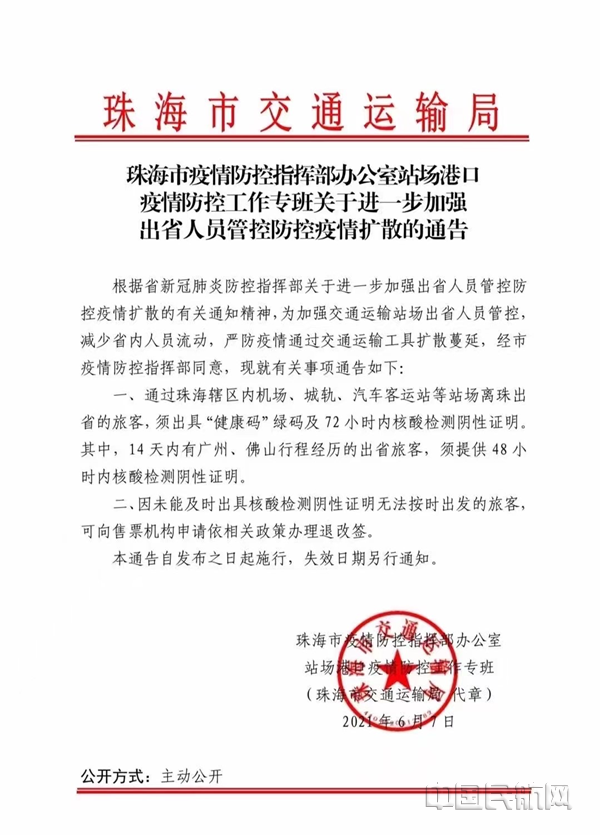 根据省、市疫情防控指挥部通知,为进一步加强出省人员管控,严防疫情扩散蔓延,珠海机场自2021年6月7日起,对所有出港旅客实施“健康码”绿码、行程经历和有效核酸检测阴性证明查验。