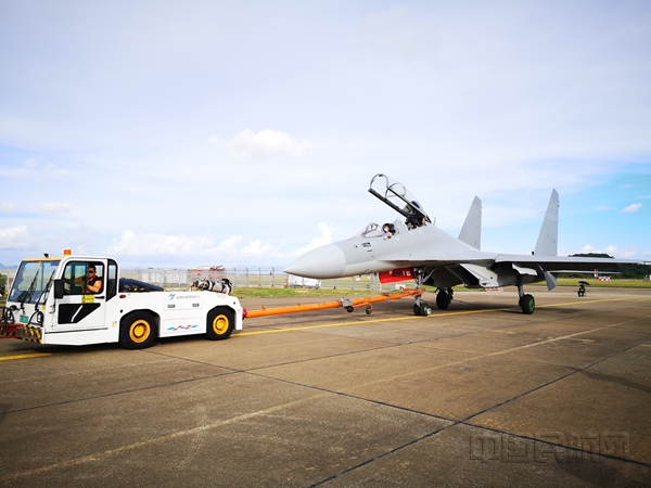 工作人员对参展飞机进行牵引