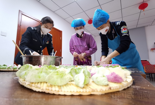春节期间韩春燕(中间)与同事们一起包饺子 (赵振龙 摄)