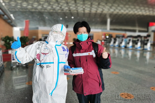 连日来,长春机场T2航站楼内,满满的都是感动与祝福。为了能让白衣天使的回家旅途放心、舒心、安心,长春机场全体在工作人员动态优化服务流程,全力做好每一个保障细节。全面开放值机柜台与安检通道,最大化提高值机与过检效率,并在每个值机柜台安排一名行李“帮帮手”,帮助医疗队员搬运大件行李;精心摆放挂置欢送横幅、彩旗,营造热烈、温暖的送行氛围;针对不同地域,细心设计的台签、标语,真挚的表达机场人的感恩之情;地服、安检引导人员再出发,组成“志愿者”小分队为最美逆行者保驾护航,全程陪伴着返程医疗队,讲解乘机流程、登机注意事项,引领办理值机、合影留念,介绍吉林风俗文化等等,竭尽所能为各省医疗队员们提供优质服务;机场配餐准备了香甜可口的饭菜,为返程医务人员带来特别的吉林美食体验;机场设计印制了上千张“纪念专属登机牌”,用民航的方式向白衣天使致敬,每位返程的医疗队队员都被这张特殊的登机牌感动;地服分公司“金达莱”班组的姑娘们再次跳起她们自编自导的手语舞,为白衣天使送上崇高的敬意。在全程热烈、温暖的氛围感染下,医疗队员们与机场的工作人员共唱《我和我的祖国》,挥舞国旗,共同抒发爱国情怀,欢送现场成了爱与红色的海洋。
