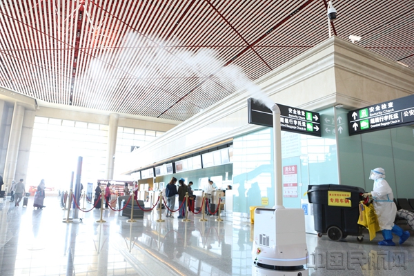 中国民航网 通讯员仇建、李晏玮 报道:“哈尔滨太平国际机场欢迎您,请佩戴好口罩,保持一米距离。”随着一声爽朗的声音,一台人型立式机器人自动运行,“头顶”喷着“白气”,自动避障人群,在候机楼里穿梭自如。这台设备便是哈尔滨机场新引进的智能消毒机器人。