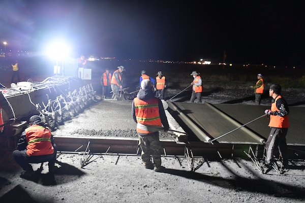 午夜时分,施工队的照明灯光照亮了整个施工现场,人机设备不断进出,施工人员有条不紊高效作业成为拉萨机场飞行区一道风景线。