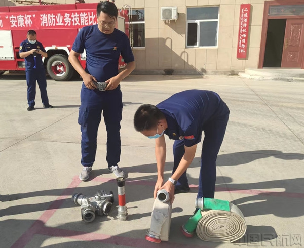 此次消防业务技能比武大赛分为个人及团体两个大项。个人项目包含:一人两盘水带连接;原地着战斗服;佩戴空气呼吸器。团体项目为初战快速出水控火操。