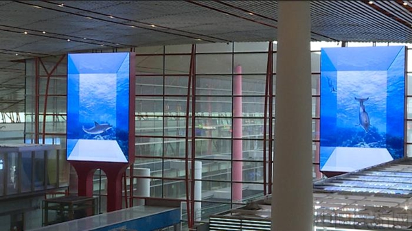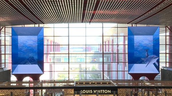 这是首都机场首块定制化“双子星”地标性裸眼3D媒体,一方波光粼粼的海底世界就此落成。