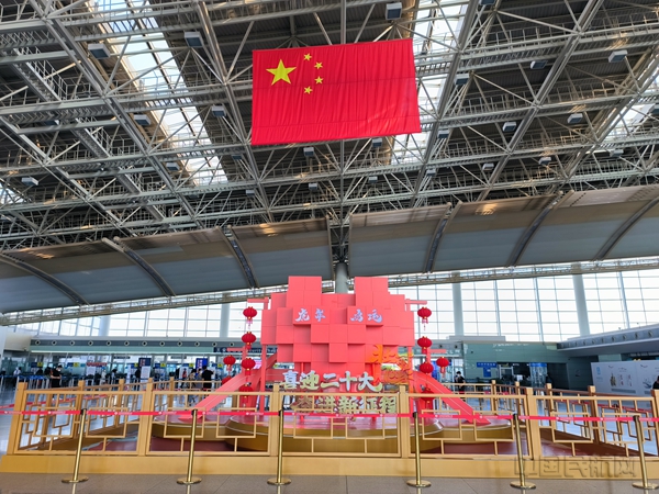 航站楼内,出发大厅悬挂了国旗,并将美陈景观内的主题元素更换一新,“喜迎二十大,奋进新征程”主题大字陈列其中,整体效果简洁大方。同时,在售票柜台、旅客服务中心柜台、中转托运柜台以及中转柜台,有关主题的贴画随处可见,整个航站楼洋溢着喜庆、热烈的节日氛围。