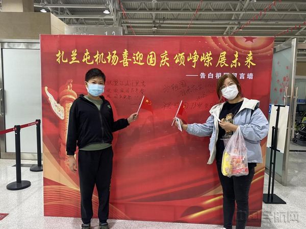 在旅客候机期间,工作人员向每位旅客发放小国旗,邀请旅客纷纷在告白墙留下对祖国的美好祝福。