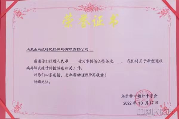 中国民航网 通讯员何治华 报道:近日,乌拉特中旗机场收到一份特殊的礼物——乌拉特中旗红十字会发来的感谢信、捐赠证书、荣誉证书,对机场公司助力疫情防控工作的爱心捐款表示感谢。