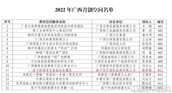 近日,共青团广西区委公布了建设首批“广西青创空间”名单,南宁机场安全检查站朱槿队成功入选。争创首批“广西青创空间”,是机场青年深入学习贯彻党的二十大精神,激励青年为公司高质量发展作出更大贡献,努力成为行业骨干、青年先锋的重要举措。