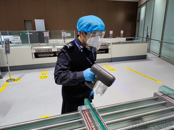 安检员对通道进行消杀