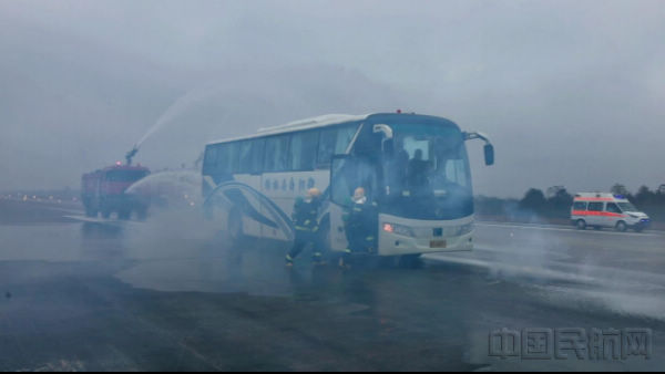 “我宣布,演练按计划进行。”随着演练总指挥下达指令后,演练正式开始,此次演练总指挥由衡阳市原副市长胡水龙担任。本次演练模拟某航空器(机型A320)于起飞爬升阶段,左侧货舱显示火警信号,确认火情后,机组通报塔台,按照程序紧急迫降本场,落地后航空器冲出跑道,前起落架陷入升降带,落地后左起落架冒烟、现明火,1号主轮爆胎,航班共有40人,其中重伤1人、轻伤5人。演练过程共设置航空器冲/偏出跑道、航空器失火、残损航空器搬移3个模拟情景。机场公司联合机场公安分局、中航油、Ameco等驻场单位,以及衡南县消防大队和衡南县人民医院等外部协议单位共计158余人共同参与,演练过程中各单位高效配合、协同作战,历时约90分钟顺利完成演练,有效检验并提升各救援单位前期处置、信息通报、火灾扑救、残损航空器搬移及协调联动等应急能力。