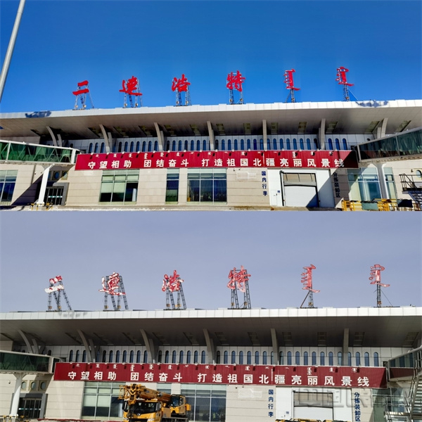 更换前的二连浩特机场国际、国内航站楼楼顶“二连浩特”、“ERENHOT”几个大字已使用十一年之久,多数字体已出现大面积掉漆以及腐锈的情况,同时由于电路老化,字体内镶嵌的LED灯频繁出现故障,夜间无法完整照亮全部字体,非常影响机场对内外形象,针对此情况,二连浩特机场委托第三方对其进行了维护更换作业,并在施工前与第三方签订了《高空作业安全协议书》。此次更换,由专业标识标牌设计公司,结合二连浩特机场航站楼整体装修风格、功能布局对“二连浩特”蒙汉英几个大字的点位设置、版面尺寸、外观风格等进行重新设计规划,并进行更换。清晰的蒙汉英文对照,大幅提升了旅客视觉感受,一处一景,让人眼前一亮,吸引着过往旅客驻足观赏、打卡拍照留念。