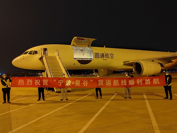 《中国民航报》、中国民航网 记者赵瑜 通讯员孙家怡 陶甄 报道: 1月6日凌晨0点38分,一架由杭州圆通货运航空有限公司执飞的B757-200F全货机从宁波机场腾空而起,飞往千里之外的泰国曼谷,标志着宁波—曼谷全货机航线正式开通。这是宁波机场新的一年开通的首条国际全货机货运航线,计划每周执行5班。