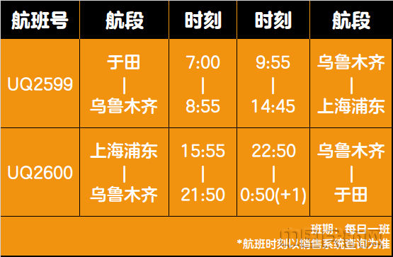 中国民航网 通讯员彭小锐 报道:1月15日起于田机场将开通于田—乌鲁木齐—上海浦东往返航线。该航线由乌鲁木齐航空B737-800型客机执飞,每日执飞一班。去程UQ2599航班将于7:00从于田万方机场起飞,8:55到达乌鲁木齐地窝堡国际机场;9:55从乌鲁木齐地窝堡国际机场起飞,14:45到达上海浦东国际机场。回程UQ2600航班将于15:55从上海浦东国际机场起飞,21:50到达乌鲁木齐地窝堡国际机场;22:50从乌鲁木齐地窝堡国际机场起飞,次日凌晨0:50抵达于田万方机场。