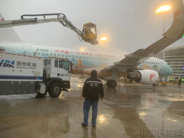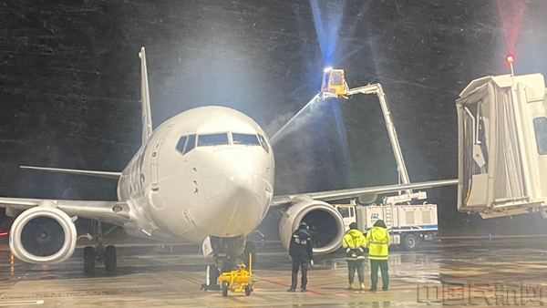 16:30,长龙航空GJ8632次航班降落后,机长提出需要开展航空器除冰工作。地服部机务和特车分队迅速响应,确认航空器除冰位置后,人员立即明确分工,按照除防冰标准化程序,高效完成了今年首架航空器除冰工作。