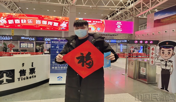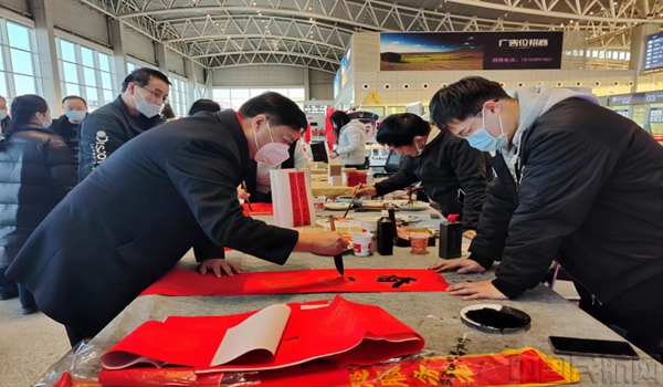中国民航网 通讯员王雪梅 报道:为丰富出行旅客的春节文化生活,营造浓厚喜庆的节日文化氛围,大年三十,包头机场开展了“写春联送祝福”活动,来自包头市青年书法家协会的多名书法家齐聚包头机场,现场挥毫泼墨,书写对联和“福”字赠予旅客,送上美好的新年祝福。