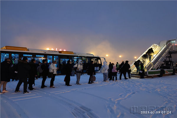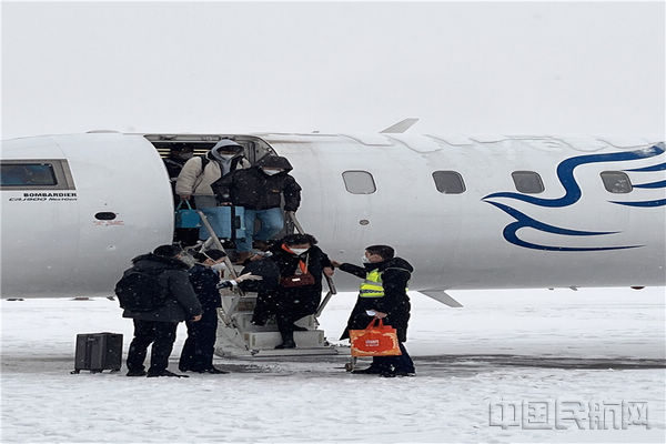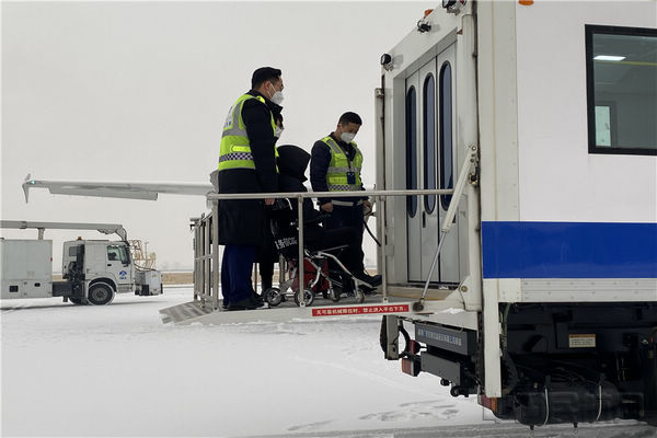 2月9日凌晨,呼和浩特机场迎来了春节后首场降雪,呼和浩特机场地面服务部各岗位协同配合,做好2023年首场降雪保障工作。图为登机口服务员保障远机位进港旅客。