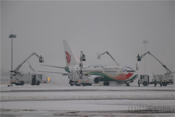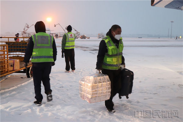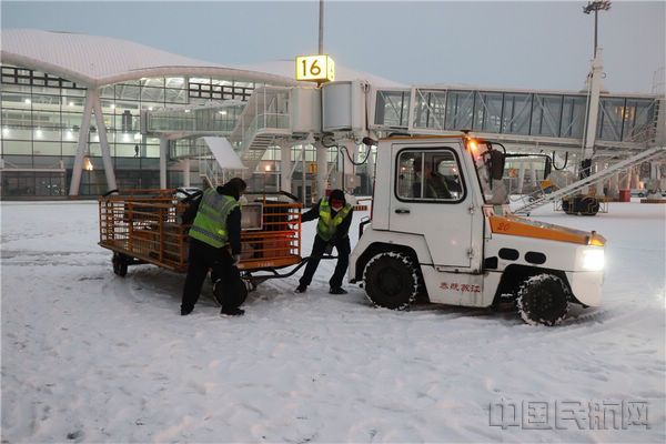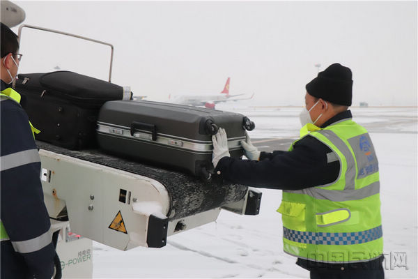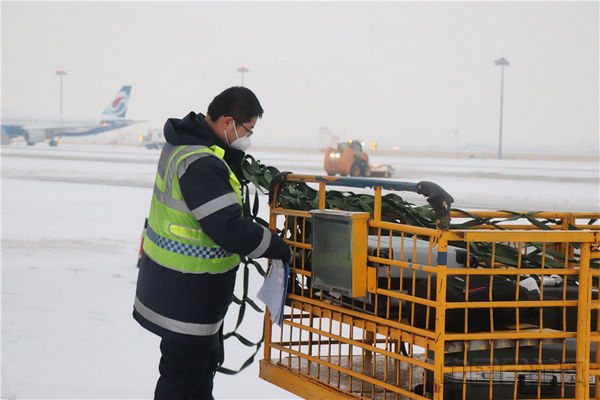 地面服务部提前做好降雪保障期间人员车辆的安排,确保当日航班保障不受影响。