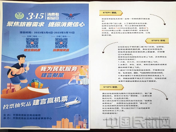 中国民航网 通讯员刘艳艳 报道:为更好地满足旅客多样化的服务需求,充分听取旅客对民航服务工作的意见建议,提升广大旅客对民航服务的获得感和幸福感,3月15日,包头机场积极开展2023年“3.15国际消费者权益日”宣传活动。