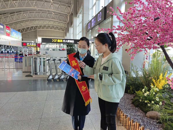 包头机场积极响应民航局“聚焦旅客需求,提振消费信心”主题安排,采用多种形式向广大旅客普及民航旅行常识和民航服务的新模式、新举措。线上,包头机场通过在微信公众号发布3.15活动宣传信息;线下,在候机楼LED大屏循环播放宣传海报,并在候机厅内发放3.15宣传单、与旅客现场互动,引导旅客参与线上答题活动。同时,以旅客的视角制作了乘机流程常识宣传单,进一步普及民航旅行常识,受到旅客一致好评。