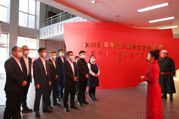 跟随着讲解员的解说,一行人分别参观了乌兰牧骑展厅、荣誉名人榜、排练厅,详细了解了乌兰牧骑在辽阔无垠的草原上啼跃66年来的光辉发展历程,深刻感悟了一代又一代草原红色文艺轻骑兵迎风雪、冒寒暑,扎根草原、服务人民的忠诚信仰、为民情怀和勇于担当、无私奉献的精神品质。