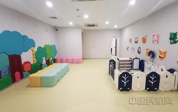 远机位母婴室位于38号登机口附近,面积达70平方米,设施配置上采用软包处理,有效避免了婴儿在玩耍时磕碰造成的伤害。走进母婴室,映入眼帘是摆放整齐的沙发、婴儿活动区围栏,墙上贴有充满童趣的卡通图案,室内配备了舒适的哺乳椅、婴儿安全座椅,带安全扣的折叠式婴儿护理台、热水宝、电源插座、紧急呼叫按钮等服务设施,贴心地关注到母婴旅客的所想所需。同时,母婴室定时进行环境消杀,为母婴旅客营造了舒适、整洁、安全的环境。