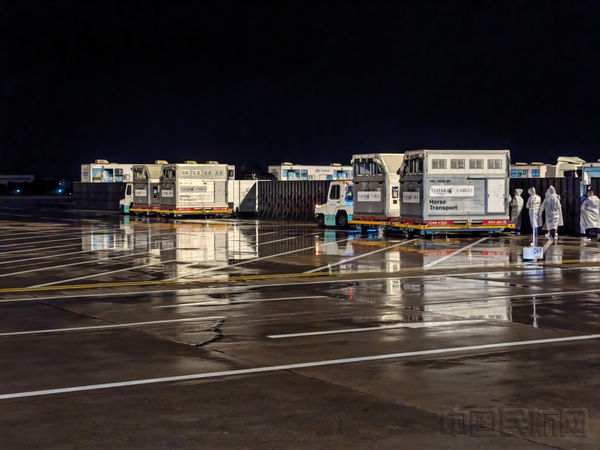 9月20日8时起,马匹运输保障小组逐一进行航班信息收集、协调清空货机坪1号坪、场地清洁消毒、协助运输商布置装卸马平台、安排专人引领监管入机坪控制区人员等工作。“机场主要领导一直在现场进行协调,我们为做好首个入境马匹航班保障做好了充分的准备。”蒋思捷说。21日凌晨2时14分,在工作人员翘首以盼的目光中,卡塔尔航空QR8530航班缓缓驶入106机位,随着47匹赛马和近20吨物资的卸机,保障小组井然有序地进行着后续的工作,驳运运马车,将空箱驳运至待清洗区,将清洗消杀后的空箱进行存场,对随机货物进行拆板、装车,截至当天早上6时完成所有马匹和货物保障工作。随着最后一匹运马车驶出,现场响起了掌声。