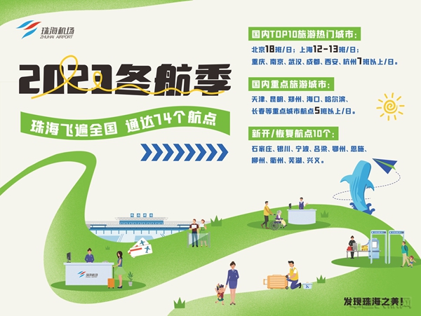 《中国民航报》、中国民航网 记者冯智君 报道:10月29日,珠海机场将执行2023年冬航季航班计划,新增及恢复石家庄、银川、宁波、吕梁、鄂州、恩施、柳州、衢州、芜湖、兴义共10个航点;重点加密了部分千万级航点,如北京、上海、天津、重庆、成都、杭州、海口、长春等。