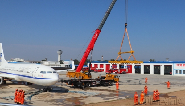 呼和浩特机场消防支队残损航空器搬移演练中消防吊装组指挥员旗语指挥吊装操作(叶长青/摄)