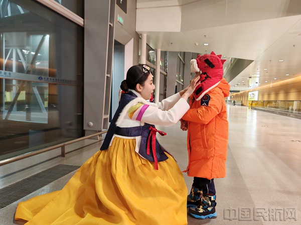 20时30分许,“砂糖橘宝宝”下机一刻,3名身穿朝鲜族服饰的“金达莱”班组成员就立刻上前热情迎接,一边协助老师查看小朋友们随身物品是否遗落,一边帮助他们提拿行李,并为每一位小朋友检查帽子、棉衣是否穿好。