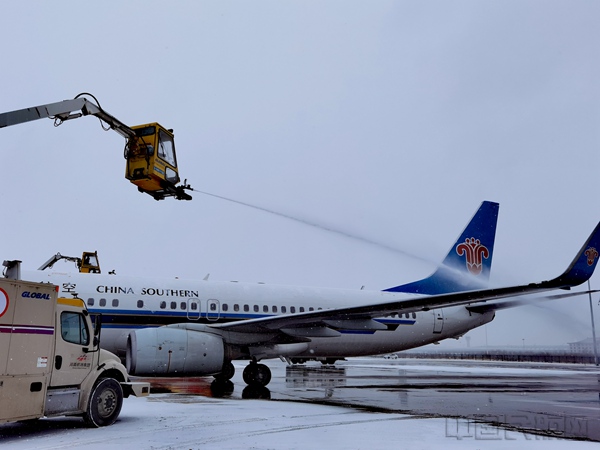 15时,在郑州机场2号跑道西区806集中除冰坪,河南飞机维修公司飞机指挥员马佳、除冰车操作员孙宇已在零下6度的寒风和飘雪中连续工作了4个多小时,其中孙宇更是单兵作战,一个人坐在除冰车的吊篮内工作。15时20分,一架南航飞机缓缓驶入除冰坪,除冰车吊篮徐徐升起后距地面高6米左右,开始对客机喷撒除冰液。这是技术活,此时机坪上风大,需要考虑风向,直接对着除冰部位喷撒,被风一吹,除冰液会吹偏。多年练就的技术,让孙宇得心应手,准确地将除冰液喷至机身上。在现场带领机务人员雪中除冰的飞机维修公司副总经理郭利明说:“郑州机场除冰雪虽然任务重,但已经制订了科学的轮班计划,让除一线员工能得到充足的休息,确保能打赢除冰雪这场‘硬仗’。”