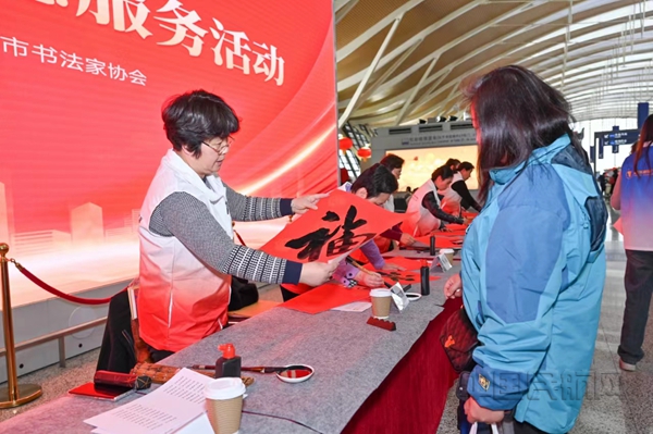 书法家们为春运旅客写福字、送祝福(顾非凡/摄)