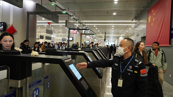 民警正在帮助旅客使用边检快捷通道(石明明/摄)
