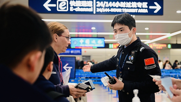 民警在浦东机场口岸为旅客提供通关咨询(王熙熙/摄)
