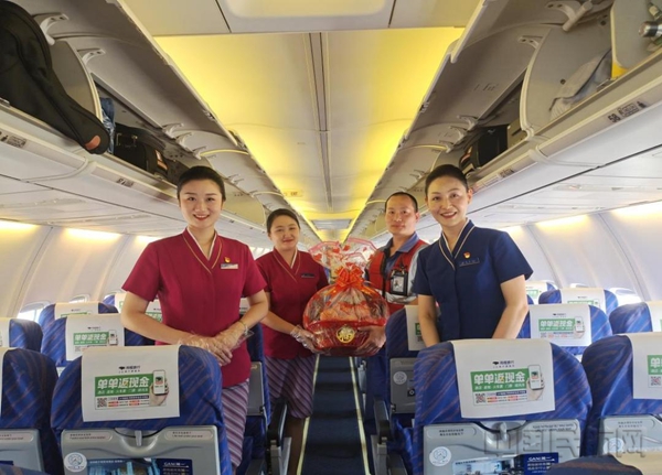 5月20日为南航正式配送餐食的第一天,桂林机场航食部工作人员为当天南航航班机组人员送上了果篮,表达了美好祝愿。
