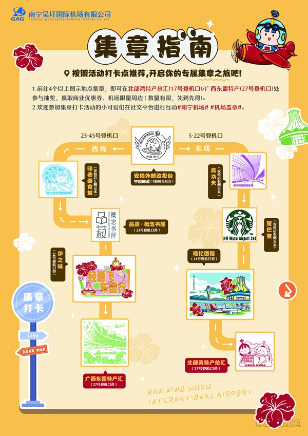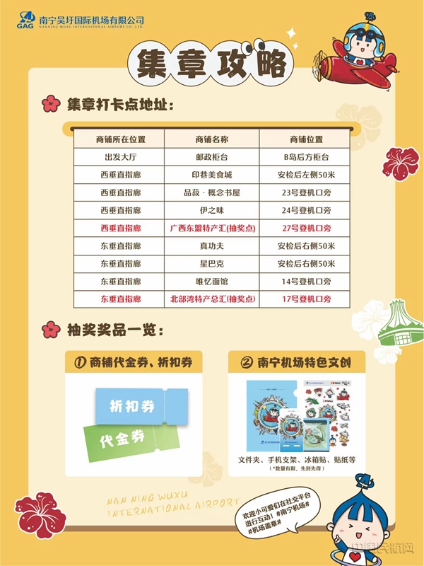 南宁机场结合航班排布及商业分布情况,为旅客精心设计了东、西两条集章路线。9款极具特色的文创印章融入了集团卡通形象IP“桂飞飞”“桂圆团子”,南宁机场“七色花”“经邕飞”“品菽•概念书屋”特色服务品牌,以及南宁机场航站楼、南宁国际会展中心等地标形象与壮乡铜鼓等代表性元素。旅客前往盖章打卡点可免费领取南宁机场明信片,并加盖特色印章,集满四个特色印章后,即可获得一次抽奖机会。抽奖奖品涵盖南宁机场特色文创、商铺优惠券等多种礼品。