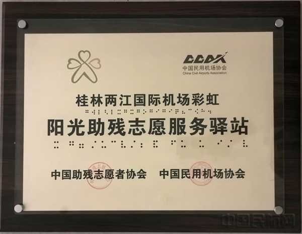 中国民航网 通讯员刘晓嫦、赖敏 报道:近日,在第九届中国机场服务大会期间,桂林机场彩虹阳光助残志愿服务驿站获“民用机场阳光助残志愿服务驿站”首批授牌。桂林机场也是全国首批23家正式授牌的机场之一。