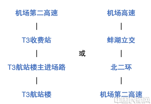 若您乘坐私家车/网约车/出租车前往白云机场T3航站楼,可选择机场第二高速-T3收费站-T3航站楼主进场路-T3航站楼或机场高速—蚌湖立交—北二环—机场第二高速。