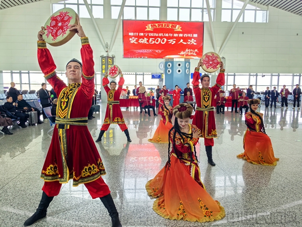 上午11时,喀什机场在T2候机楼内举行了庆祝活动,精心准备了喀什特色器乐演奏《喀什赛乃姆》、舞蹈《我的爱献给祖国母亲》等文艺节目和砸金蛋游戏,为旅客乘机旅途带来意外惊喜。随着欢快的民族音乐响起,身着艾德莱斯绸的舞者们以一场热情洋溢的开场舞迅速点燃现场活动气氛。不少旅客主动加入舞动区域,随着音乐翩然起舞,来自天南海北的旅客们纷纷驻足,举起手机记录下这难忘的场景。砸金蛋环节将现场气氛推向高潮。金蛋中准备了艾德莱斯工艺品、航空模型、特色干果等丰富礼品。每一次金锤落下,都伴随着欢呼与掌声。活动现场还进行了抖音直播,为不能在现场参加活动的人们提供了网络观看选择,达到1.6万人次观看点赞。