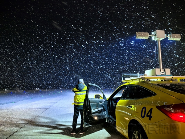 17日晚,首都机场场道管理巡查员对跑道摩擦系数进行检测。(李德军/摄