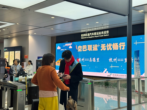 活动当日,JD606马德里—杭州航班落地杭州机场后,约150名乘客在杭州机场汽车客运站,搭乘直达青田的免费大巴,顺利返乡过年。浙江青田作为全国著名侨乡,春运期间将迎来大批从海外返乡过年的青田华侨,为方便侨胞们乘车回家,杭州机场推出“空地联运”服务,提供免费大巴车辆接送服务,打通了回乡的“最后一公里”。侨胞旅客到达机场客运站后,工作人员会根据航空公司提供的乘车旅客名单提前录入身份信息,同时站内售票开设青田班线专用安检、检票通道。杭州机场客运站副站长叶胡丹介绍,首航承运的杭州往返马德里、里斯本航班的青田旅客可享受免费接送往返杭州机场的服务,沿线温州、丽水地区的旅客也可免费乘坐。