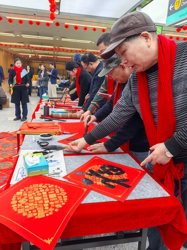 此外,为迎接浙江籍侨胞春节返乡,杭州机场还准备了一系列特色温馨的服务。旅客一落地,机场客运站就有专门的接送机引导服务,由于侨胞的大件行李很多,工作人员在引导的同时也会帮助侨胞旅客推送行李到客运中心进行安检。在完成行李安检后,在等候区会送上春联、福字等纪念品。上了大巴车后,车上还会提供春节特色大礼包,让侨胞旅客在杭州就有回家过年的氛围感。与往年不同的是,今年在以往的特色基础上,在候车厅里,书法家现场为侨胞书写并赠送春联、“福”字,工作人员为侨胞旅客奉上一碗热乎乎的腊八粥。候车的时候,侨胞旅客还可以体验拓印制作等简短的非遗项目,在“祝福墙”或“许愿树”上,写下新年寄语祝福,并在“国门同框”合影区打卡留念。让归乡返程的旅途更加丰富多彩。