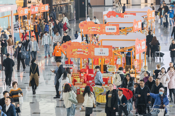 在业态布局方面,市集汇聚30余家优质品牌商户,展销商品涵盖地方特色美食、文创潮品及限量版年货礼盒等多种品类,满足旅客春运途中的多元年货采购需求。市集期间还限时发放专属优惠券,适用于年货礼品、特色零食等多款指定商品,助力旅客实现“欢乐购物、实惠出行”。