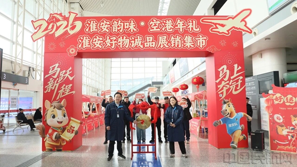 《中国民航报》、中国民航网 记者胡夕姮 通讯员李倩报道:2月9日9时30分,随着一声金锣敲响,为期5天的“淮安韵味·空港年礼——2026淮安好物诚品展销集市”在淮安涟水国际机场航站楼大厅正式开市。近40家淮安本地老字号、名优特产及非遗文创商户集中亮相,非遗糖画、巧手面人、浦楼酱醋、高沟捆蹄等琳琅满目的匠心手作与特色年货吸引众多旅客驻足品鉴,为繁忙的春运旅途增添了浓浓年味。