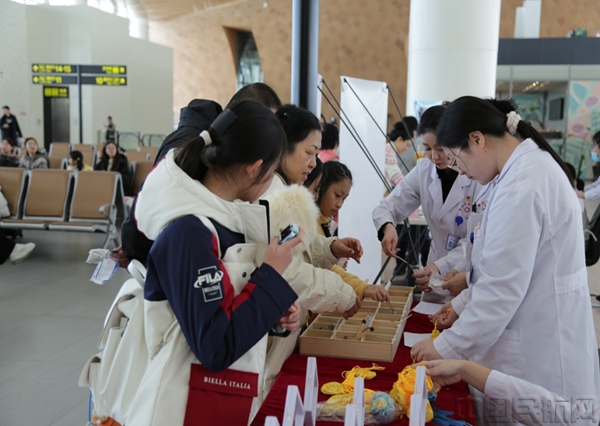 除专业康养服务外,现场文化体验环节人气爆棚。“中药香囊DIY区”内,旅客在中医指导下,根据自身需求搭配艾叶、丁香等药材,亲手制作兼具养生功效与节日寓意的香囊。此外,特别设置“白八味药材展示”,不少家长带着孩子驻足学习,传承中医药养生知识。